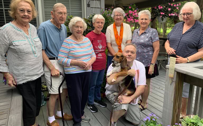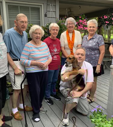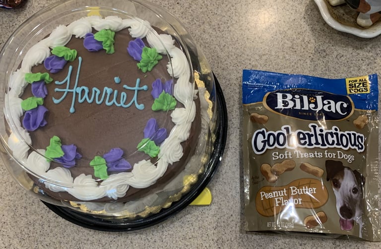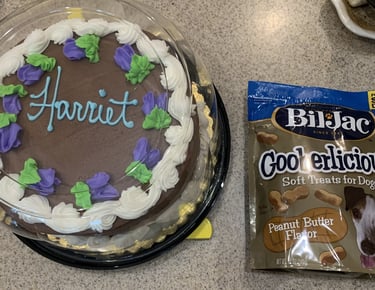 Mountain View Book Club No. 1 in Fairfield Glade had the pleasure of meeting Harriet on Sept. 15, 2025. I spoke briefly to the club about how I came to write the book. But Harriet stole the show as she strolled among the members, some of whom fed her doggy treats while her owner, Jody Farley, answered questions about her. (I didn't mind playing second fiddle to Harriet.) The hostess, Ann Chard, got a chocolate cake with "Harriet" written on it for the occasion. Holding Harriet is Jody, and club members are, from left, Carolyn Merrill, Preston Farquhar, Ruth Farquhar, Ann, Cinda Leber, Linda Anderson and Lesley Whiston.
