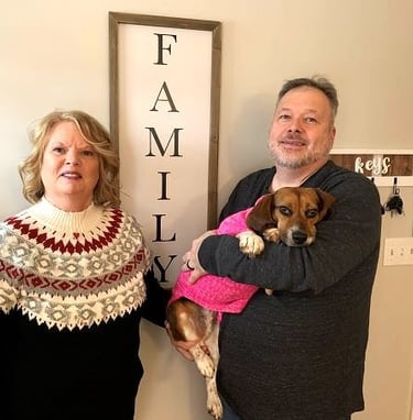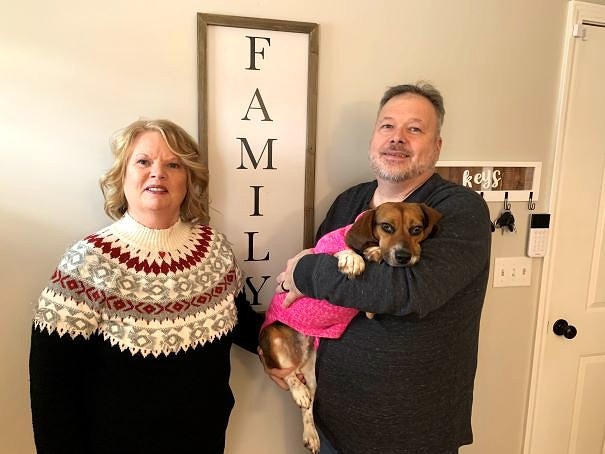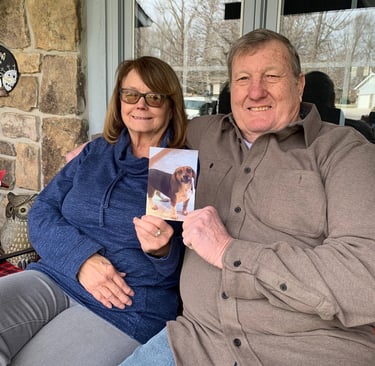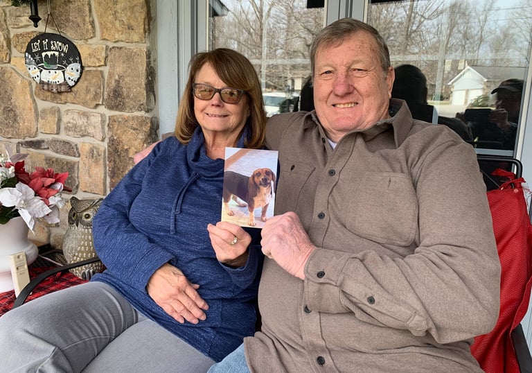 Rick and Sue Griesmann sit on their front porch with a picture of Harriet shortly after they captured her. The story of Harriet started when Sue just happened to see a little beagle dash across the porch in a windy rain storm. (Photo courtesy of the Grismanns.)