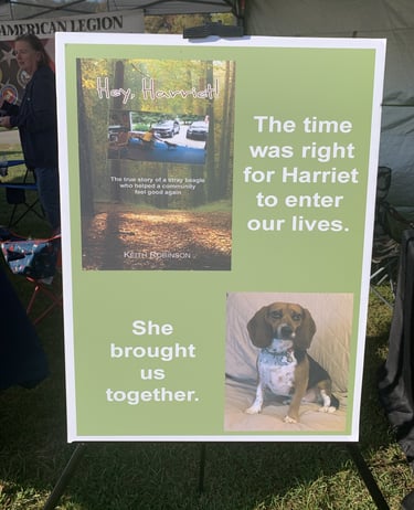Mountain View Book Club No. 1 in Fairfield Glade had the pleasure of meeting Harriet on Sept. 15, 2025. I spoke briefly to the club about how I came to write the book. But Harriet stole the show as she strolled among the members, some of whom fed her doggy treats while her co-owner, Jody Farley, answered questions about her. (I didn't mind playing second fiddle to Harriet.) The hostess, Ann Chard, got a chocolate cake with "Harriet" written on it for the occasion. Holding Harriet is Jody, and club members are, from left, Carolyn Merrill, Preston Farquhar, Ruth Farquhar, Ann, Cinda Leber, Linda Anderson and Lesley Whiston.